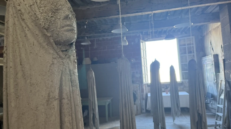 Sadafs utställning består av två delar. En del med foton av kvinnor som mördats av regimen. Den utställningen kommer att visas. Den andra delen kommer däremot inte att visas. Den består av kvinnoskulpturer i betong som föreställer svävande, hängande kvinnor i muslimska heltäckande chador. ( https://dms-api.ntm.eu/api/v1/images/rkxn2nxl/smart/width/980/height/551/as/webp )